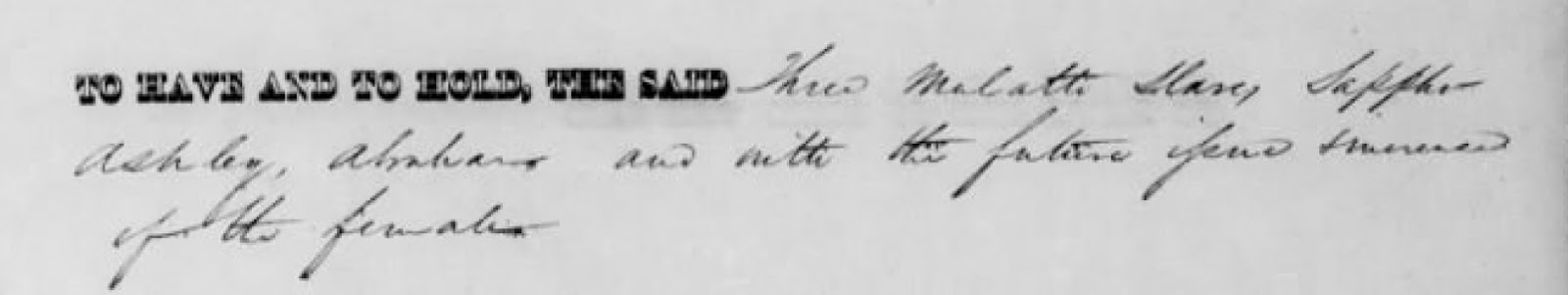 Having helped many African American families trace their lineages over the years, I have been wondering who might Rose and Ashley have been. Rose was a common name for enslaved women. The marvelous searchable database of the South Carolina Department of Archives and History generates hundreds of entries from its digitized collection of slavery-era wills, bills of sale and other documents, when the query “Rose (Slave)" is entered. However, Ashley was a comparatively rare name in the 19th century for enslaved women, being used more often for men (as in "Solomon Ashley Northup," author of Twelve Years a Slave). The South Carolina database has only two antebellum entries I believe for “Ashley (Slave).” One of them is a bill of sale, recording the purchase of three “mulatto slaves” to John E. Bonneau named “Sappho, Ashley and Abraham,” dated 25 May 1836. “Sappho” was clearly female and “Abraham” was clearly male. But what about “Ashley,” who might have been of either gender? Fortunately, for our purposes, Ashley's gender is implied by a phrase in the bill of sale, “Three mulatto slaves Sappho Ashley Abraham and with issue [thereof?] of the females;” the use of the plural indicates that both Sappho and Ashley were female. (By law and convention, the enslaved or free status of a person followed the status of the mother, so the authors of wills and bills of sale were usually carefully to append, “and the future issue thereof,” to any mention of female slaves who were, or who might someday, be fertile.)
